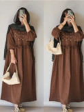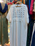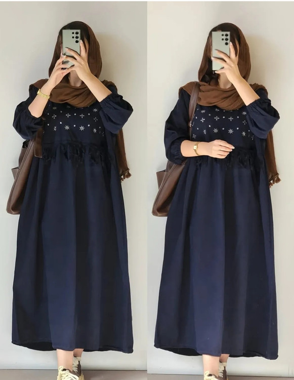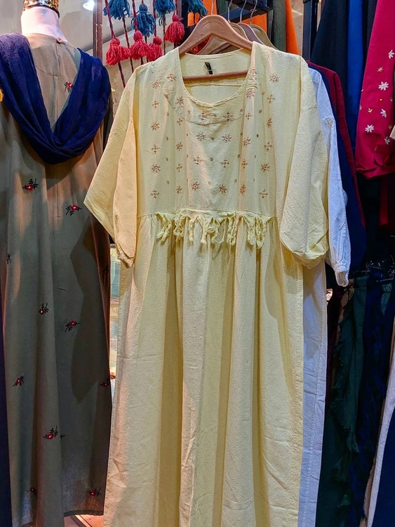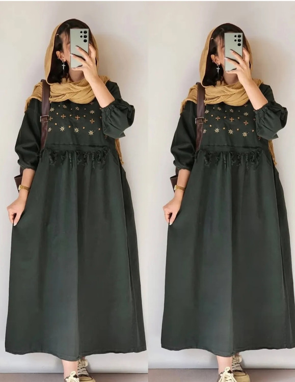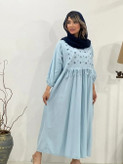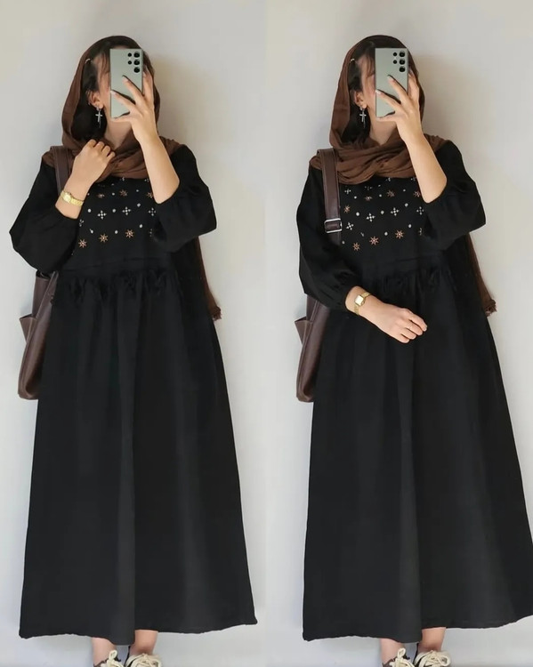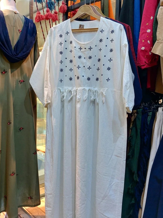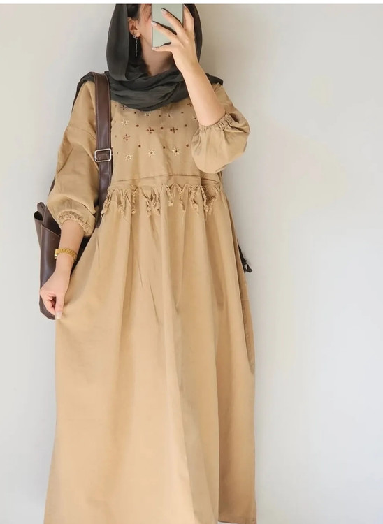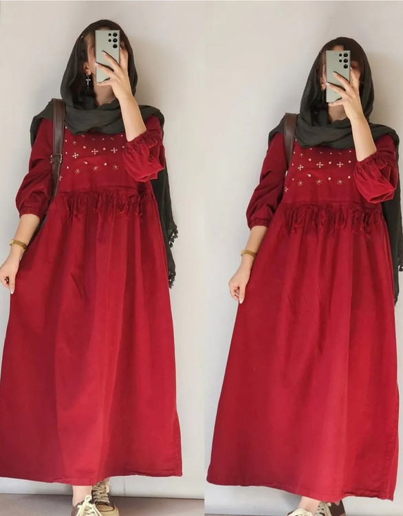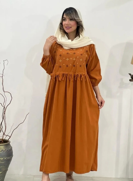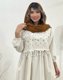 این پیراهن بلند با پارچهی الیاف طبیعی، گلدوزیهای ستارهای و چینهای عروسکی دقیقاً همون چیزیه که دنبالش بودی!